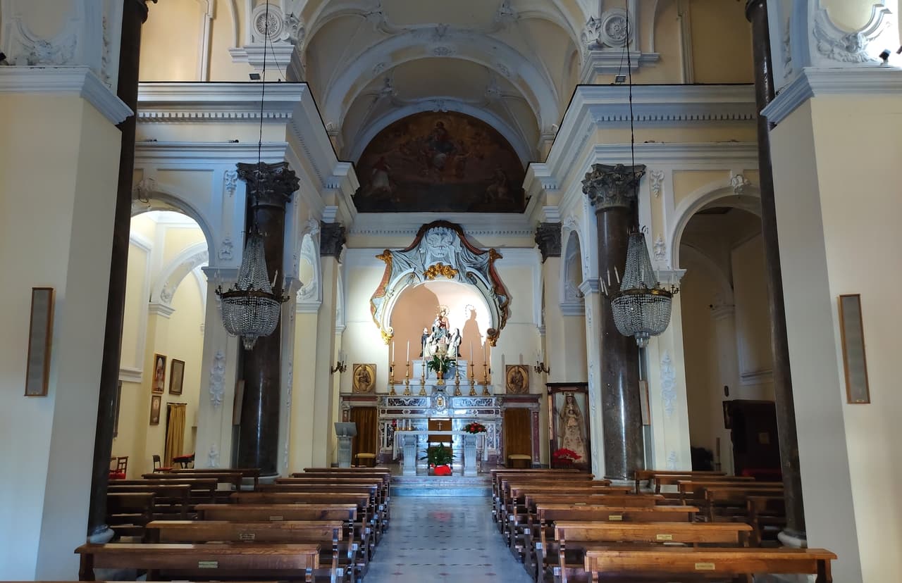 Da notare, appoggiate ai pilastri della crociera, quattro colonne rossicce in marmo con capitelli corinzi. Si fanno notare gli altari delle due uniche cappelle laterali, in particolare quello di sinistra : sopra all’altare di destra è la tela dell’Annunciazione, di Massimo Stanzione, ma bella è anche la tela del transetto di sinistra ,marmo policromi che riporta l’Incoronazione della Vergine, di Angelo Mozzillo. Molto in alto in controfacciata è la cantoria con l’organo e sotto si può vedere uno stemma nobiliare e la citata lapide con l’epigrafe dei lavori del 1646.