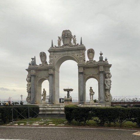 La vicina Fontane del Gigante o anche chiamata dell’Immacolatella è un’ opera seicentesca del Berinini e del Naccherino, Essa come vedete è collocata su un basamento e formata da tre archi a tutto sesto con decorazioni che rappresentano animali e mostri marini, statue fluviali, cariatidi e in alto gli stemmi del vicere, del re e della città.