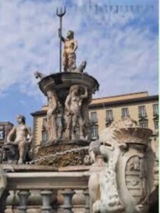 La Fontana di Nettuno è senza dubbio una delle opere più note e rappresentative del patrimonio monumentale napoletano. Essa è la fontana della città più nota a tutti i napoletani , ma è anche una delle più complesse sotto il profilo progettuale e simbolico, come dimostra la sua lunga e irregolare vicenda storica, segnata da numerosi spostamenti e trasformazioni. Inserita in una tradizione figurativa ampiamente diffusa nell’Italia della seconda metà del Cinquecento, la fontana si colloca accanto ai celebri esempi di Messina, Firenze, Bologna e Roma, dove la figura di Nettuno, divinità delle acque, assume un ruolo centrale nello spazio urbano, circondata da una ricca schiera di creature marine — tritoni, sirene, nereidi, ippocampi e mostri acquatici — che ne amplificano il valore iconografico e scenografico.