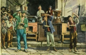 Si , proprio così … avete capito bene …..la farina e la semola venivano mescolati in una grande madia con i piedi scalzi , da uomini chiamati impastatori grondanti di sudore con addosso luridi stracci . Altri uomini versavano nella badia continuamente dell’acqua bollente . Gli impastatori , malgrado le scottature , continuavano a pigiare l’impasto in quanto all’epoca c’era la convinzione comune che il contatto con il composto lenisse le piaghe .