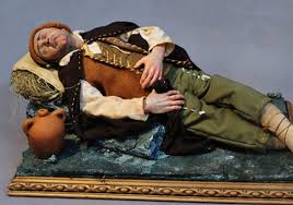 Dalle sue sponde egli ci racconta che si innalzavano fumi densi, mentre dalle sue acque scure venivano fuori esalazioni di gas che non permettevano neanche agli uccelli di volarci sopra. Intorno era circondato da colline rivestite con folti e scuri alberi così da formare tenebre boschi che erano consacrati a un’antica divinità che fu chiamata con diversi nomi: Proserpina, Ecate, Giunone e Averna. Per questo motivo gli antichi credevano che fosse lì il regno dei morti, l’Ade, dove Odisseo incontrò l’indovino Tiresia e dove il pio Enea poté rivedere il defunto padre Anchise, accompagnato dalla Sibilia, e Orfeo provò a riprendersi Euridice incantando Plutone.Venne quindi identificato dagli antichi come lo specchio d’acqua cantato da Omero e da Virgilio e tutti credevano che quello specchio d’acqua, nato da un antico cratere ormai spento, celasse la porta di ingresso agli inferi. Il luogo appariva ricco di paura e mistero poichè oltre al lago nero su cui non potevano volgersi in volo gli uccelli, questo era anche il luogo dei vaticini della Sibilla, delle misteriose grotte abitate dai Cimmeri e della inestricata e inesplorata foresta sacra a Proserpina. Come vedete tutto torna…. - Il monaco,sempre presente sul presepe viene letto nel presepe napoletano in chiave dissacrante, come simbolo di un’unione tra sacro e profano .
