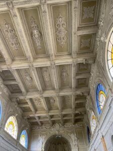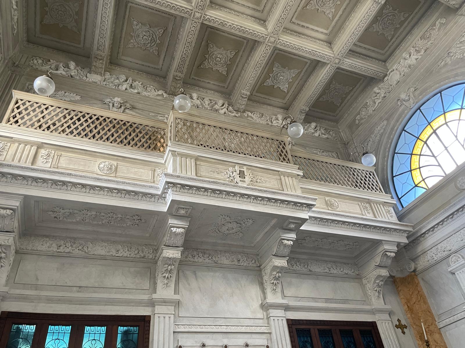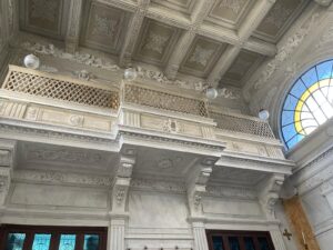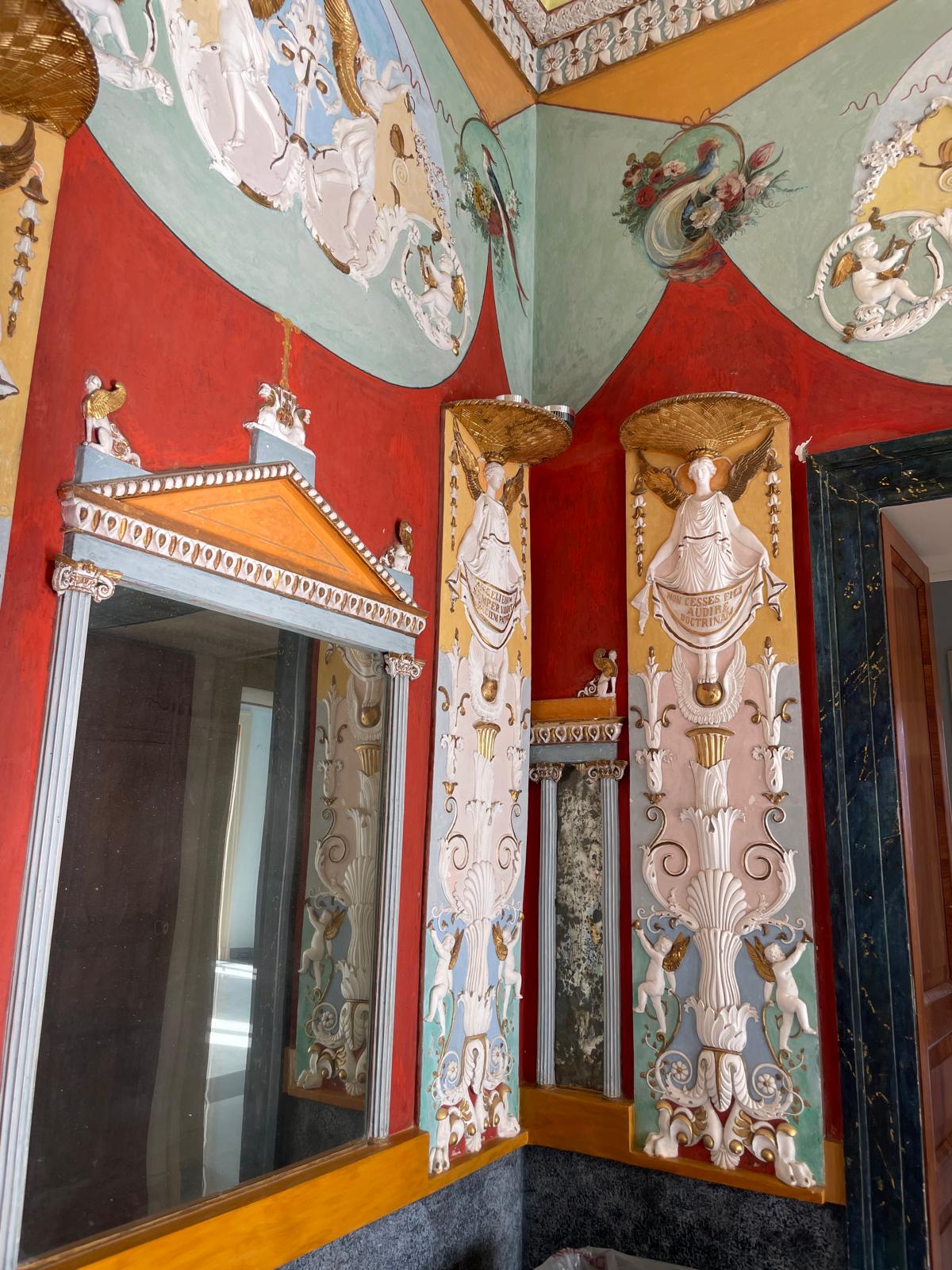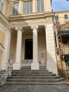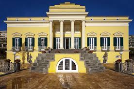 Gli esterni furono realizzati in uno stile neoclassico, l’atrio in stile pompeiano e logge in stile palladiano con colonne ioniche su tutti i lati.