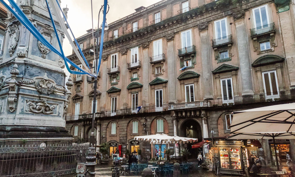Piazza San Domenico è una delle piazze più importanti di Napoli, ricca di storia e arte. La piazza fu voluta da Alfonso I di Napoli, a cui si deve la grande scalinata a fianco alla chiesa di San Domenico Maggiore.