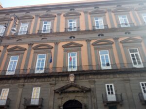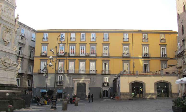 Il palazzo Saluzzo di Corigliano, oggi di proprietà dell’istituto universitario orientale, fu edificato per Giovanni de Sangro duca di Vietri nella prima meta’ del XVI secolo, fu poi acquistato dai Carafa e dai Gambacorta, finchè Agostino Saluzzo, duca di Corigliano, potente banchiere di origine genovese ne divenne proprietario nel 1727.