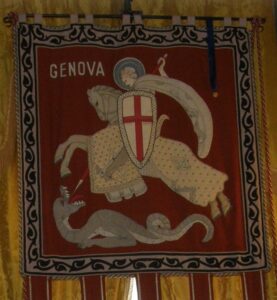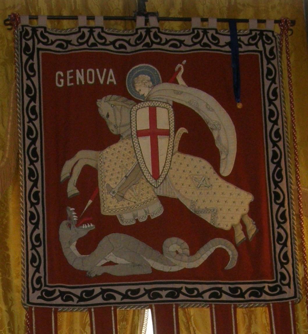 A tal proposito si narra che nel VI secolo l’esercito bizantino, di stanza a Genova, per omaggiare il santo portò nella piccola chiesa di San Giorgio una bandiera costituita da una croce rossa in campo bianco. Quella croce divenne il vessillo della Repubblica di Genova, che lo adottò ufficialmente nel 1096. Successivamente lo stesso simbolo venne scelto dalla Lega Lombarda e dai guerrieri crociati che, arrivati in oriente per combattere gli infedeli, non potevano non lasciarsi sedurre dal santo cavaliere nemico dei pagani: il culto di Giorgio venne portato così in tutto il mondo cristiano, radicandosi soprattutto in ambienti militari.