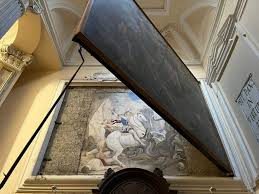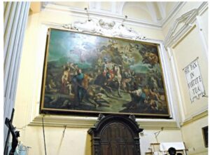 Questo capolavoro è visibile in quanto oggi, la sovrastante opera del D’Elia è stata sistemata su un telaio incernierato che è spostabile con una lunga corda al fine di rendere visibile anche il sottostante nascosto affresco del Falcone, una bellissima opera del 1645 che, a differenza di altri affreschi dell’artista, ha mantenuto splendidamente conservati i suoi colori.