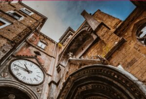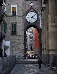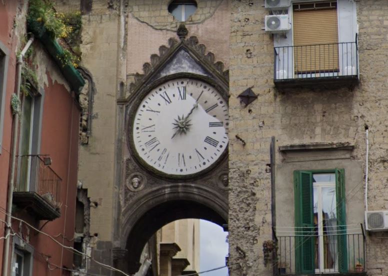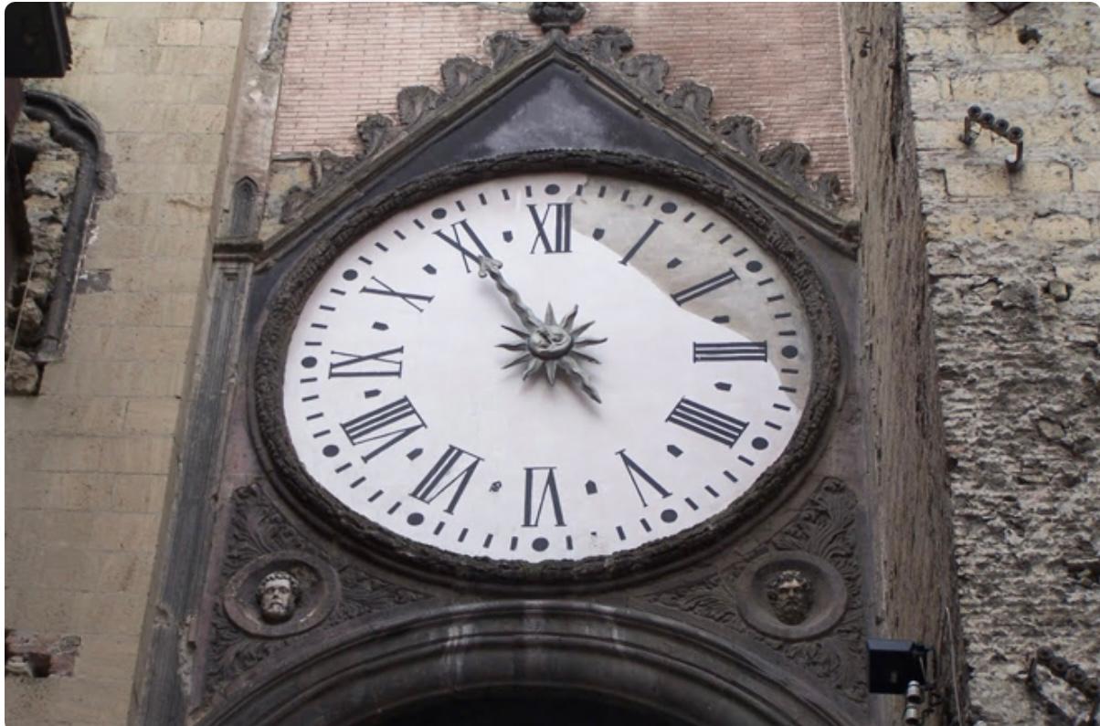 Dovete innanzitutto dapere che nel corso del quattrocento, addossato alla chiesa, fu eretto un arco che collegava il campanile con un edificio adiacente la struttura. Si tratta di un arco a due piani : il secondo decorato con stemmi aragonesi, si dice, ospitasse una stanzetta in cui i condannati a morte trascorrevano le ultime ore prima di essere giustiziati, mentre al primo piano in stile gotico si trova invece posizionato il nostro curioso orologio, che ha comunque due facce.
